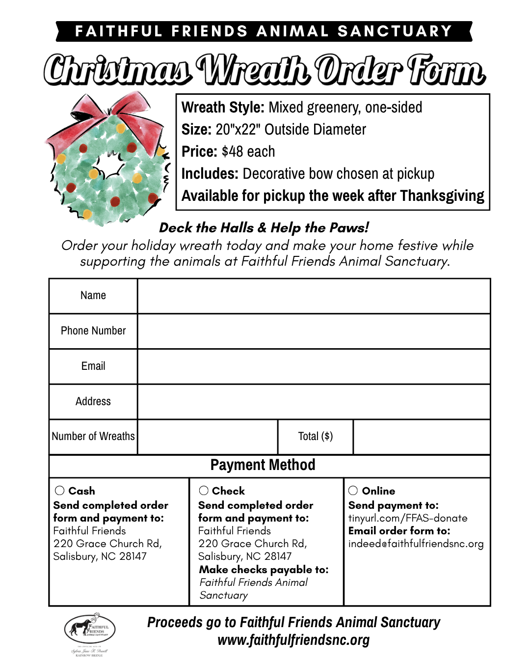 Get into the holiday spirit and make a difference for animals in need! All proceeds from our Christmas Wreath Fundraiser go directly to Faithful Friends Animal Sanctuary, supporting the daily care of the dogs and cats who call our sanctuary home. ❤️
